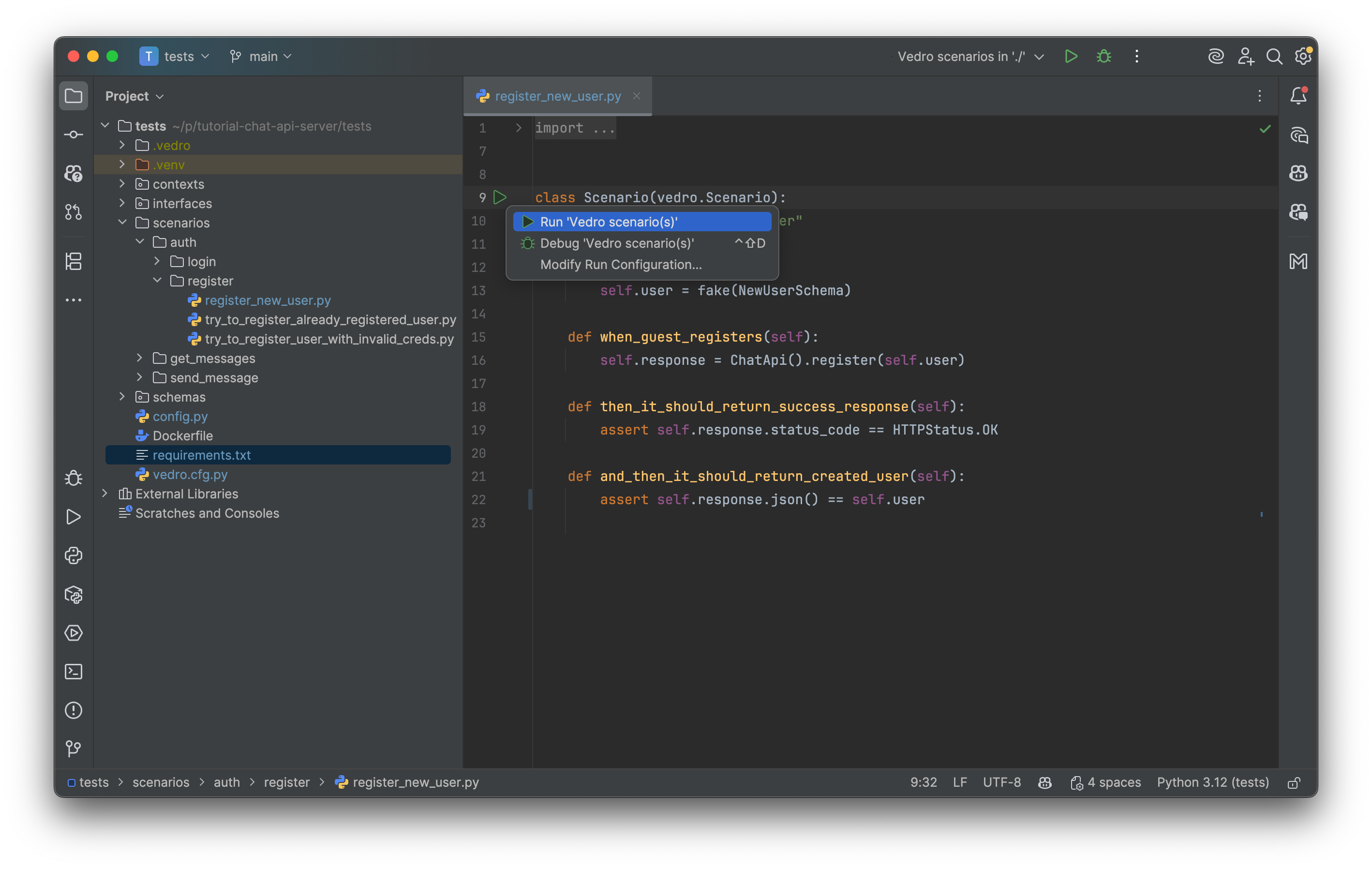 You can also right-click any scenario file or directory and choose “Run/Debug Vedro scenario(s)” from the context menu. This is a quick way to run an entire group of related tests.